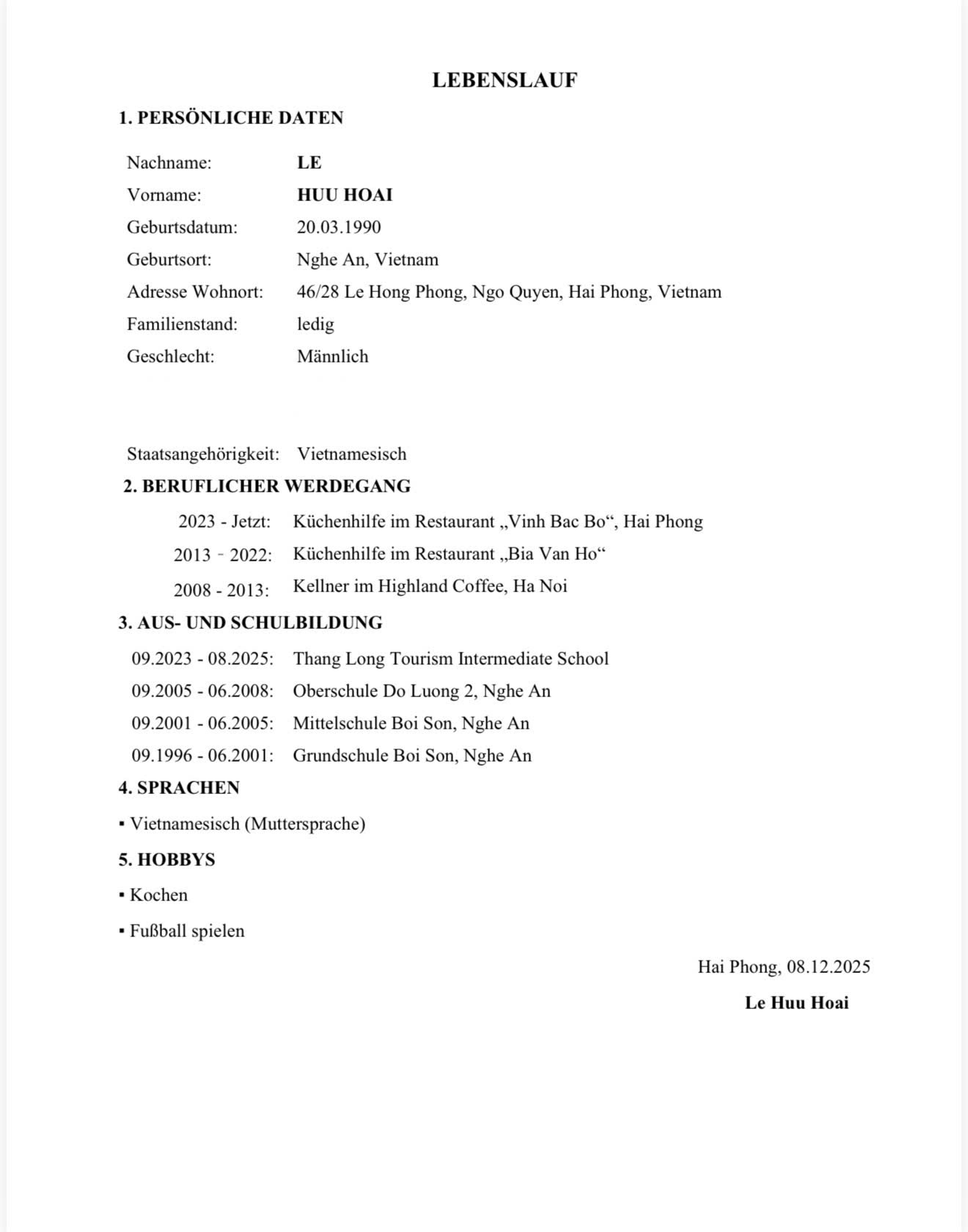 2023 – đến nay : Làm tại nhà hàng „Vinh Bac Bo“, Hải Phòng